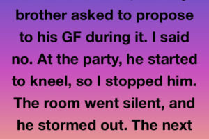 I planned a small baby shower at a hall, and my brother asked to propose to his girlfriend during it. I said no. At the party, he started to kneel,… Read more