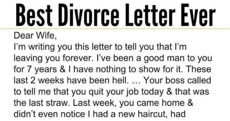 I’m writing you this letter to tell you that I’m leaving you forever. I’ve been a good man to you for 7 years & I have nothing to show for… Read more