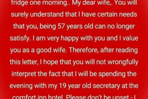 One morning, Claire, a 57-year-old devoted wife, found a note on the fridge from her husband, Daniel. In the letter, he explained that while he appreciated her care, he believed… Read more